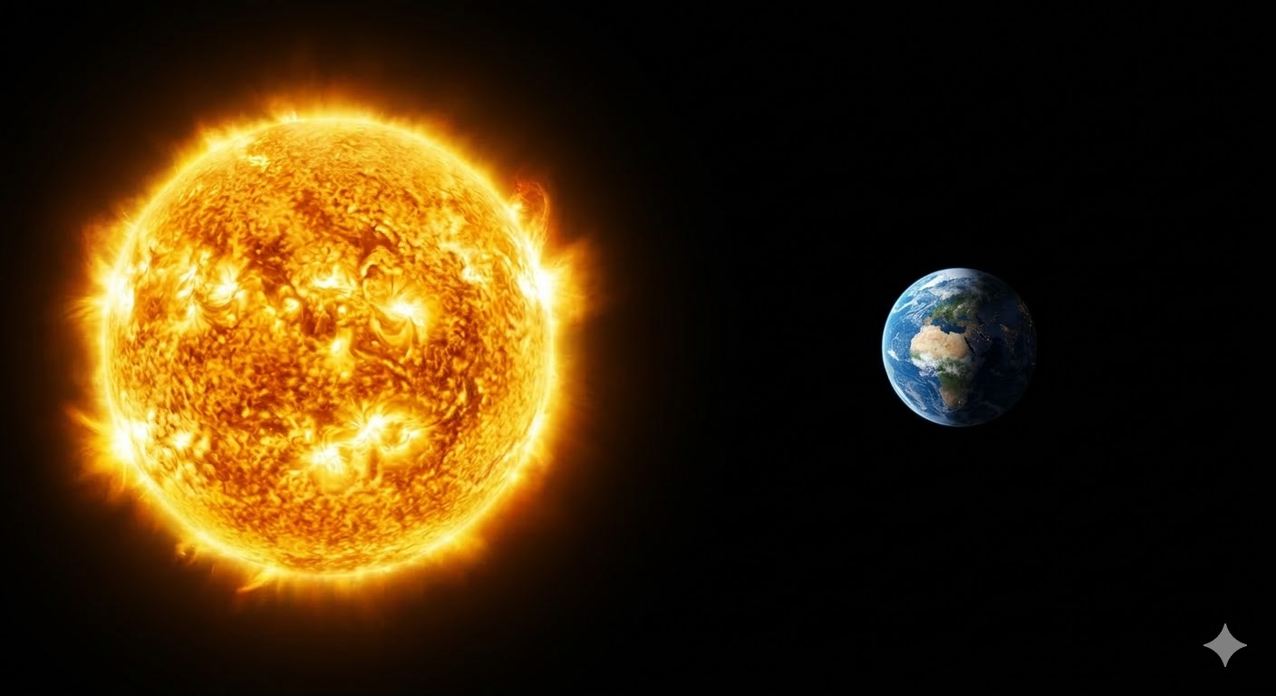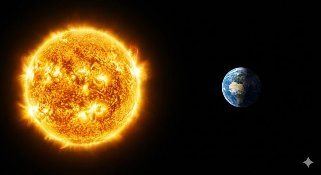 Jarní rovnodennost znamená nepřekvapivě okamžik, kdy na Zemi na začátku jara zažíváme stejně dlouhý den jako noc. Samozřejmě, spíše bychom měli říci „téměř stejně dlouhý“ nebo „přibližně stejně dlouhý“ – všichni chápeme, že ve vesmíru jsou vůči sobě všechna tělesa v pohybu a neexistují zde žádné pevné body, takže žádné pravidlo není zcela dokonalé. V den rovnodennosti je ale rozdíl v délce dne a noci velmi malý, pouze asi 20 minut, a Slunce v ten den svítí kolmo na zemský rovník. Pro lepší názornost si řekněme, že pak nastává situace velmi podobná té na obrázku dole. Ve skutečnosti je samozřejmě zemská osa nakloněná a Země by musela být mnohem menší a dál.